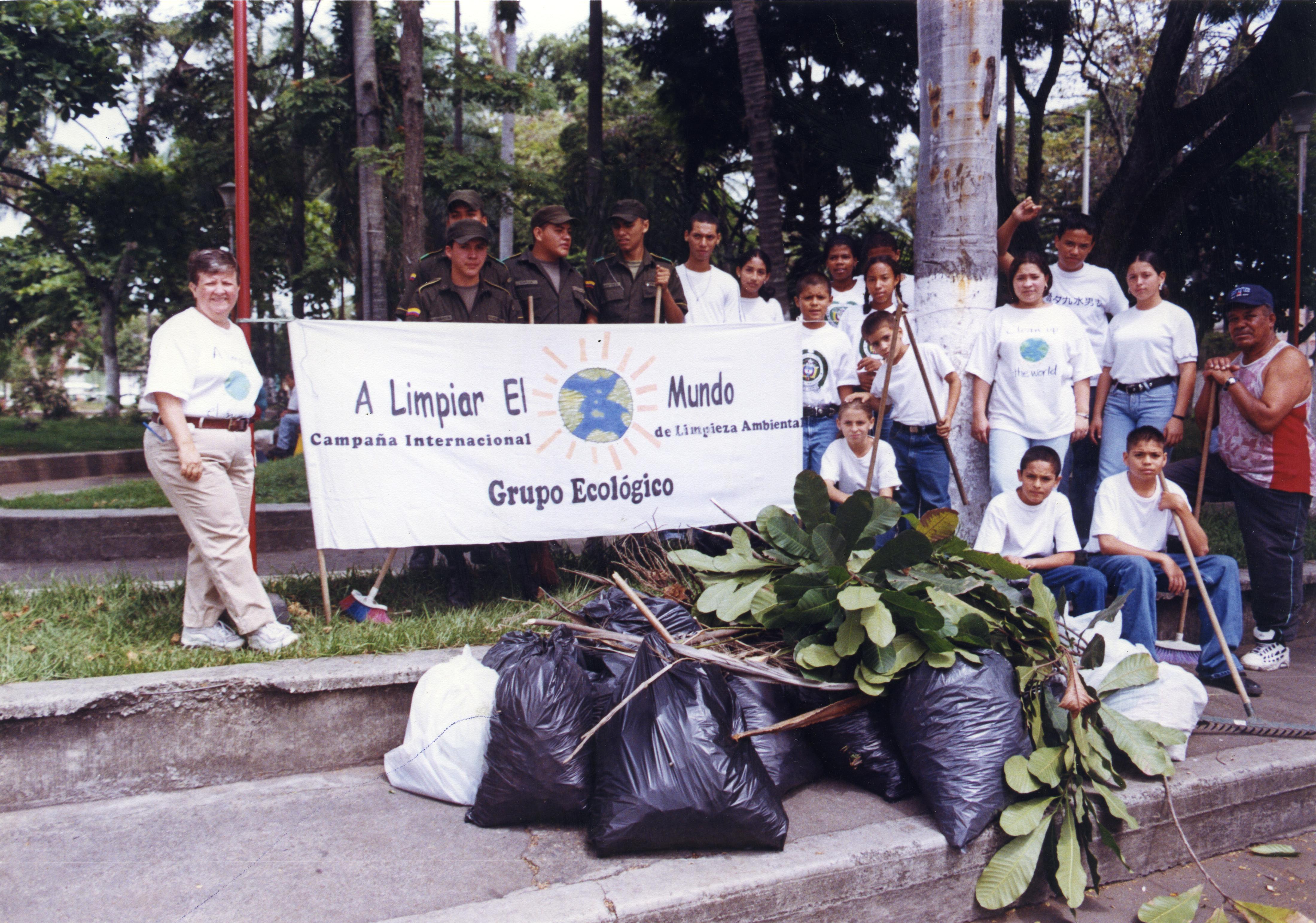 En la gráfica aparece Grupo Ecológico: A Limpiar el Mundo Campaña Internacional de Limpieza Ambiental. Observamos niños, mujeres, hombres y policía