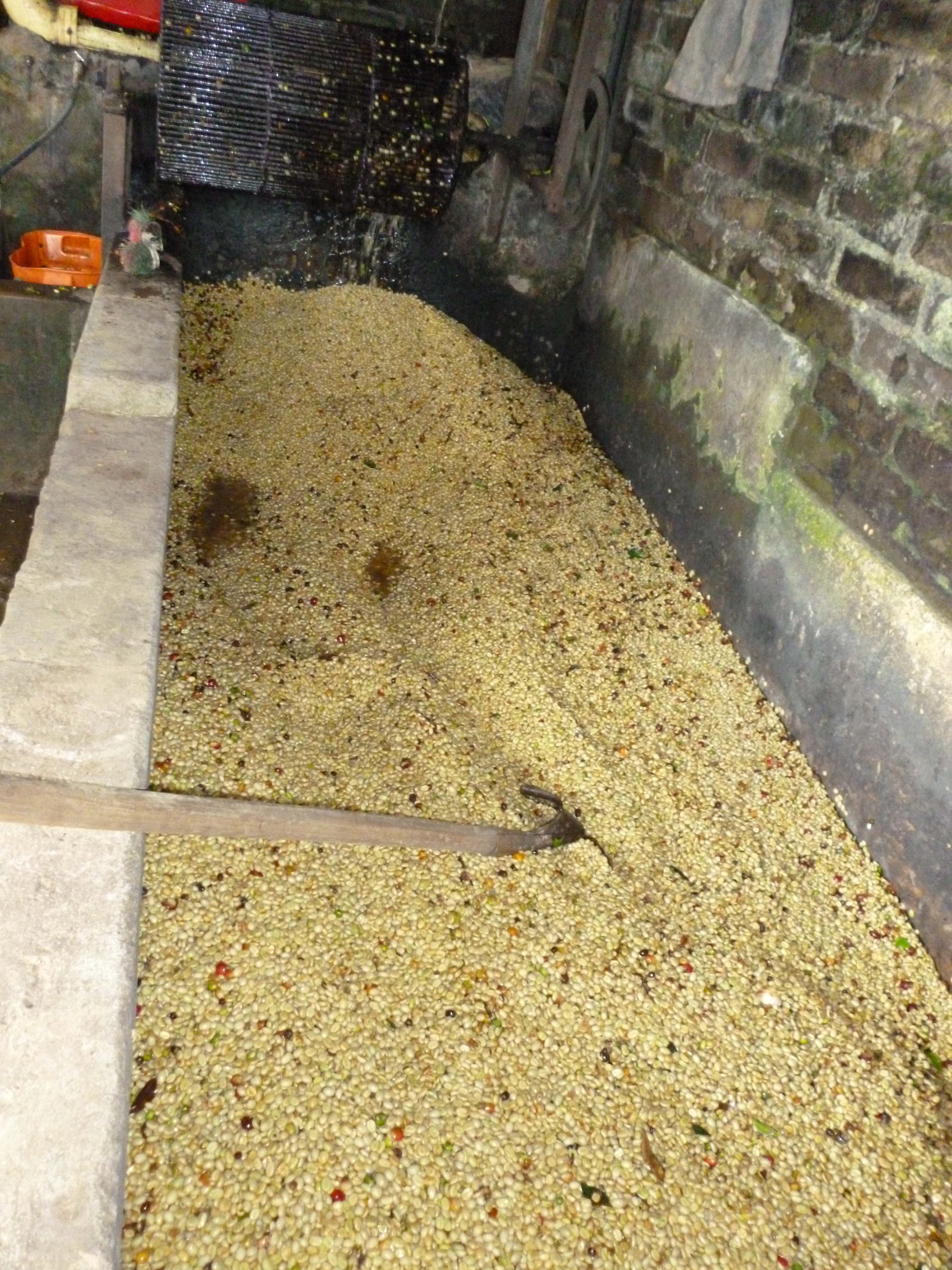 El Águila, Valle del Cauca. Fundado en 1899, por Emelecio Duque, Marcelino Echeverri y los hermanos Bernardo y Natalio Serna. Municipio desde 1947. Economía importante en agricultura, caficultura, ganadería, minería, explotación forestal, etc. Observamos en la imagen, zona de beneficio y maquina despulpadora de café