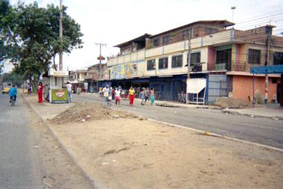 Plano general. Exterior día. Calle con perspectiva lineal. Sujetos en vía. Centro de comercialización y distribución de víveres de fondo.