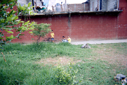 Niños en acera al lado de muro de residencias. En primer plano zona verde. Plano medio.