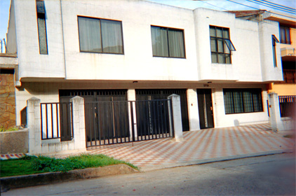Plano medio. Fachada de vivienda de dos plantas. Atardecer.