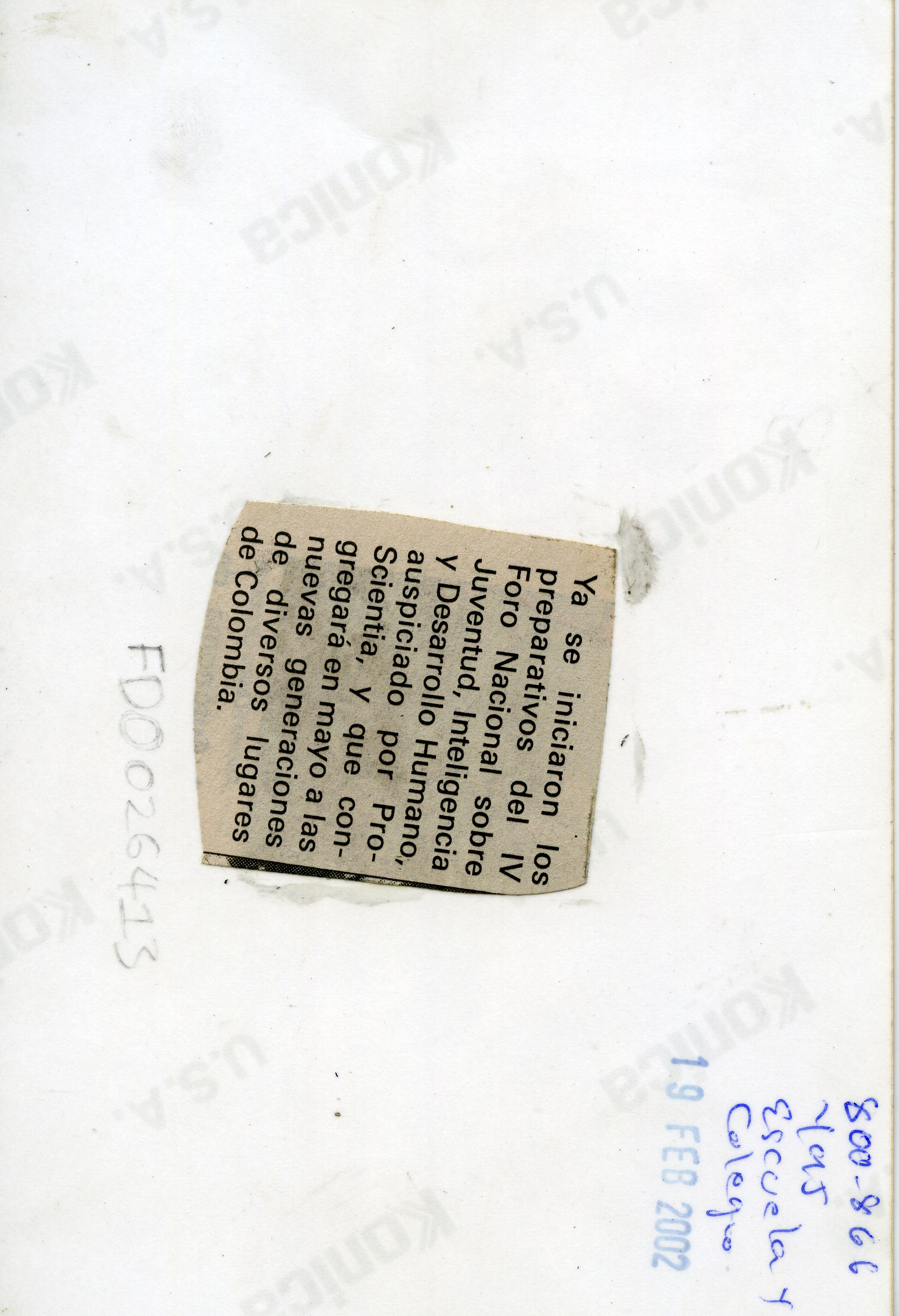 | dc.description.abstract | Al reverso de la fotografía se anexa recorte: Ya se iniciaron los preparativos del IV foro nacional sobre juventud, inteligencia y desarrollo humano, auspiciado por ProScientia, y que congregara en mayo a las nuevas generaciones de diversos lugares de Colombia. | spa |