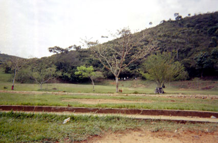 Plano general. Exterior día. Perspectiva de zona verde junto a río Meléndez. Sujetos en alejamineto en centro de cuadro escénico.