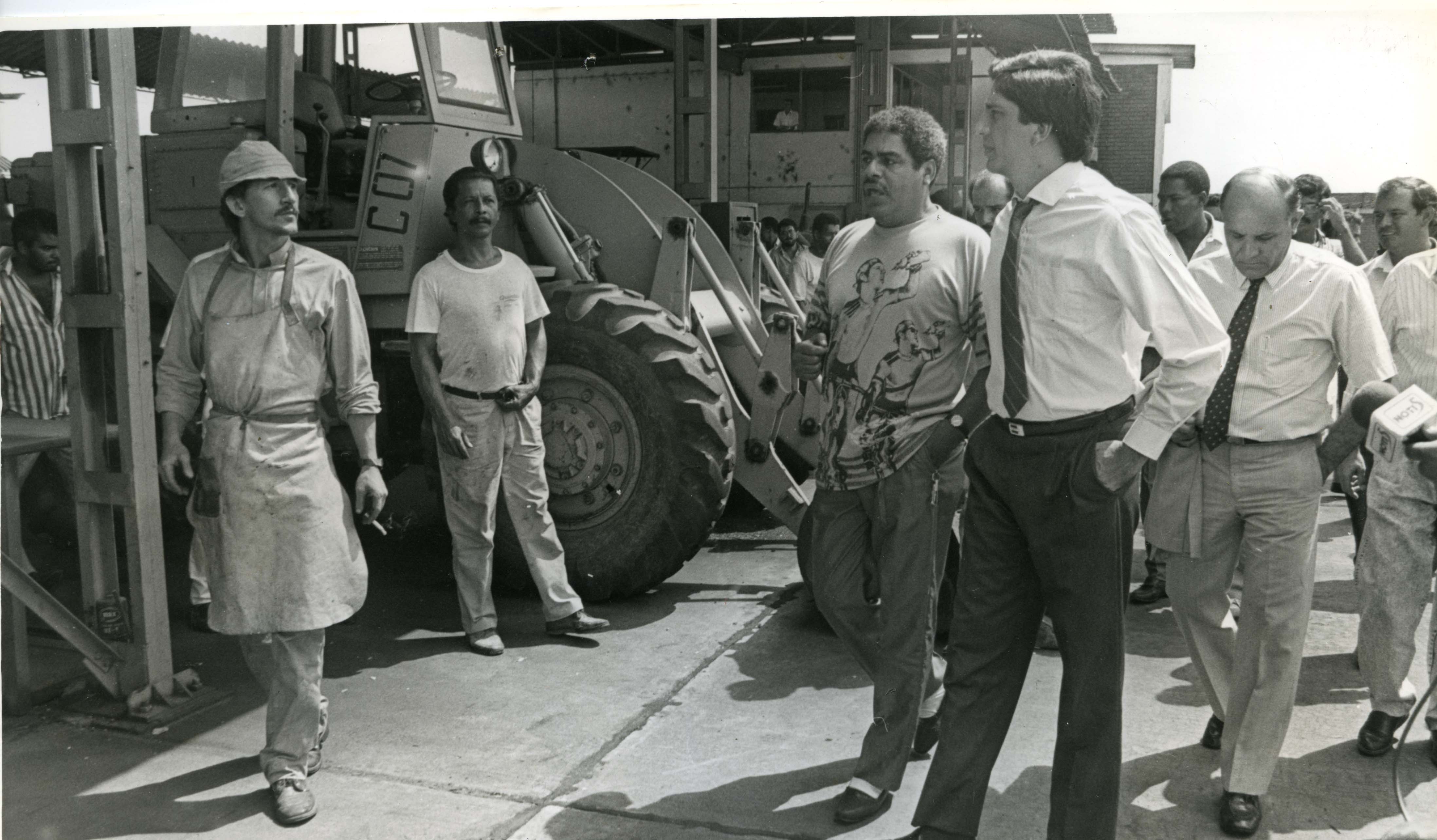 En el pie de foto dice lo siguiente: El Gobernador del Valle del Cauca, doctor Mauricio Guzmán Cuevas, realizó una visita sorpresa a los Talleres del Departamento. El mandatario seccional dialogó con los operarios y atendió sus inquietudes---El Archivo del Patrimonio Fotográfico y Fílmico del Valle del Cauca es responsabilidad de la Biblioteca Departamental del Valle Jorge Garcés Borrero, por convenio de cooperación suscrito con la Secretaria del Cultura Departamental, con el fin de aunar esfuerzos para su conservación, preservación y divulgación del Archivo entre la comunidad Vallecaucana, especialmente entre los estudiantes e investigadores que visitan la Biblioteca, propiciando el su uso y consulta permanente. La universidad Icesi es un colaborador en el proceso de difusión, facilitando la tecnología que permite la consulta de las imágenes.