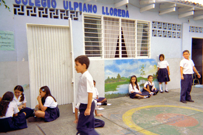 Plano medio. Niños vestidos con uniforme, en al patio del colegio Ulpiano LLoreda. En uno de los muros una pintura.