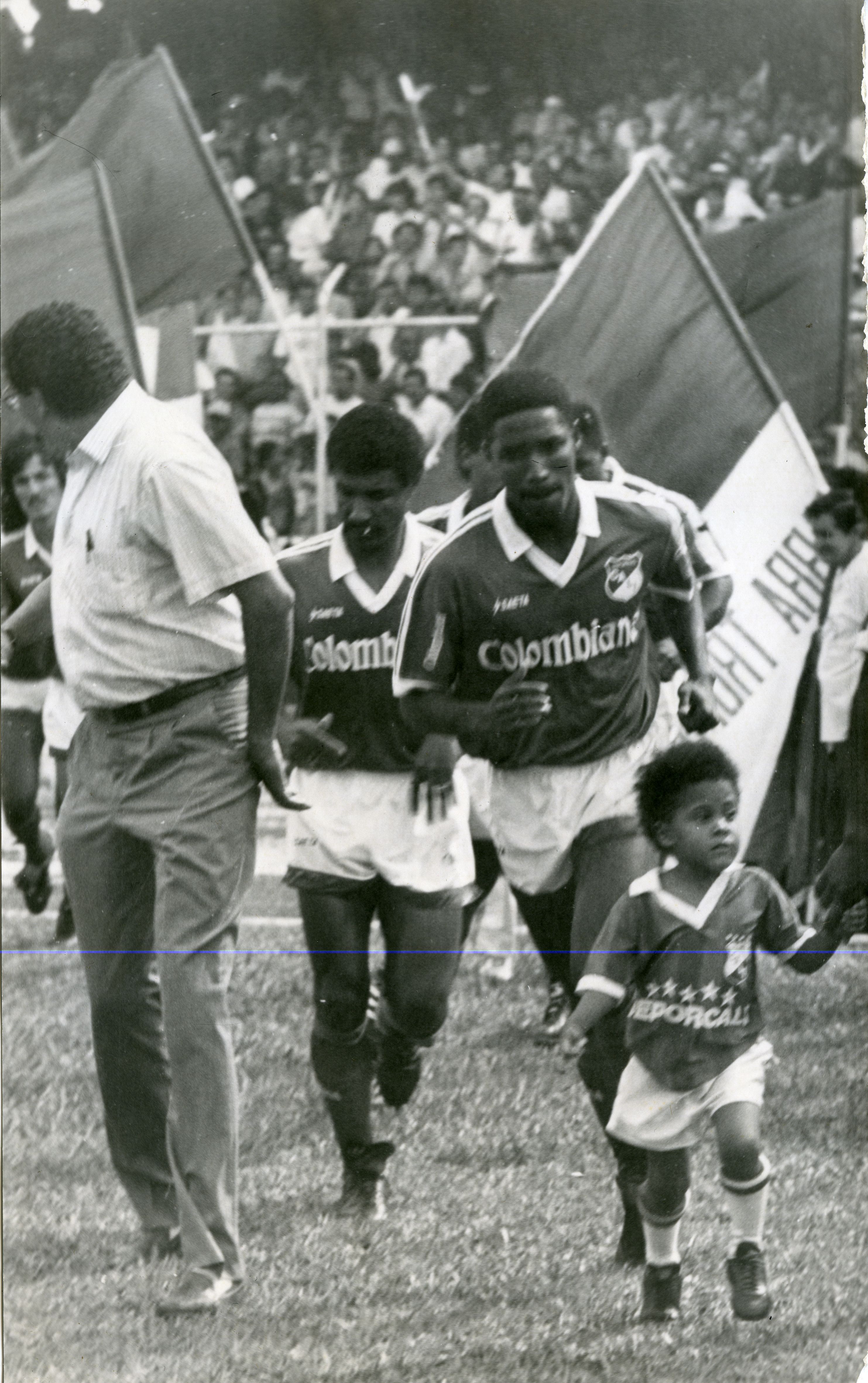 Partido de fútbol del Deportivo Cali. Se aprecia a los jugadores saliendo a la cancha.