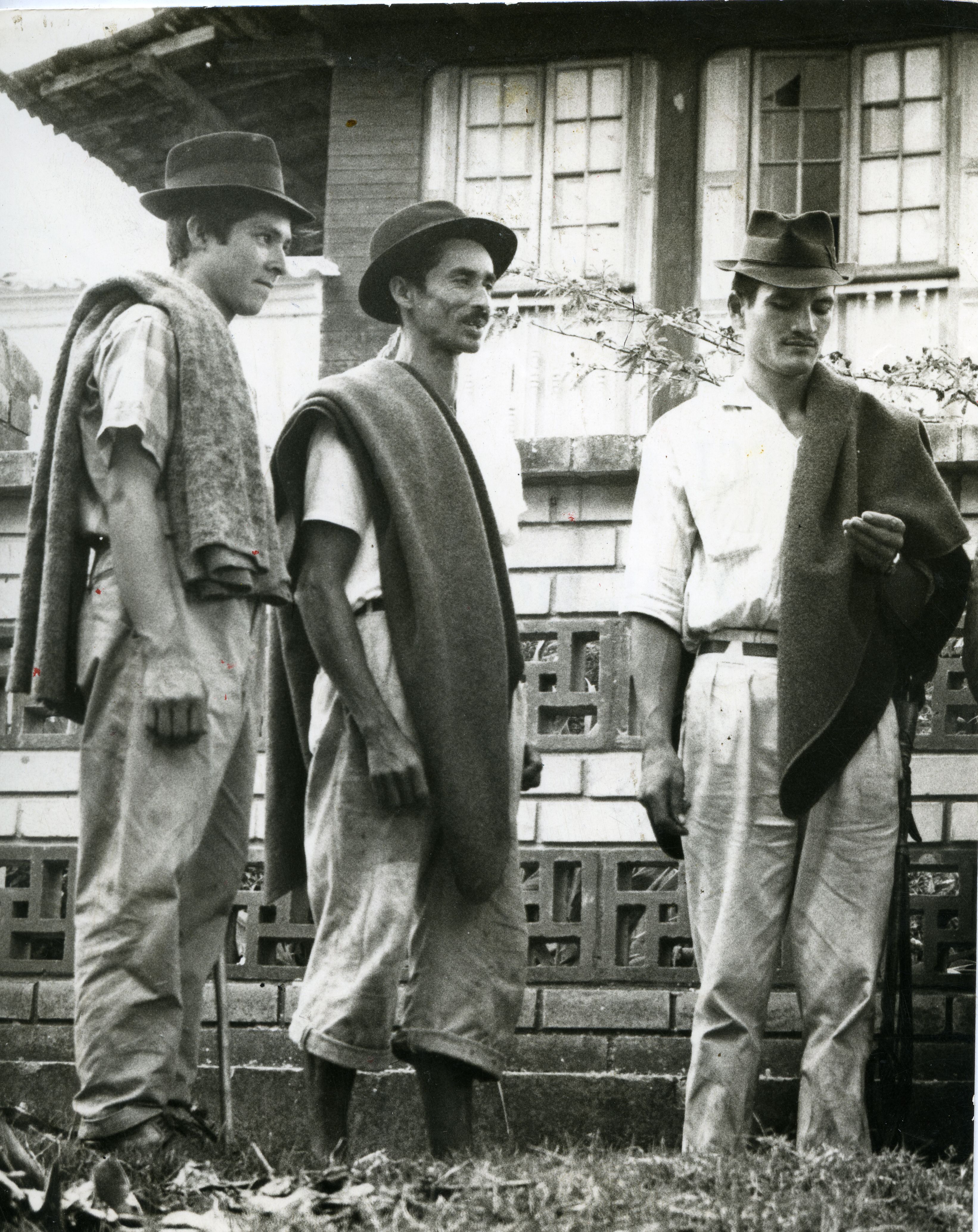 Campesinos de pie vestiditos de ruana, sombrero, que representa atuendo de campesinos de diferentes regiones de Colombia.