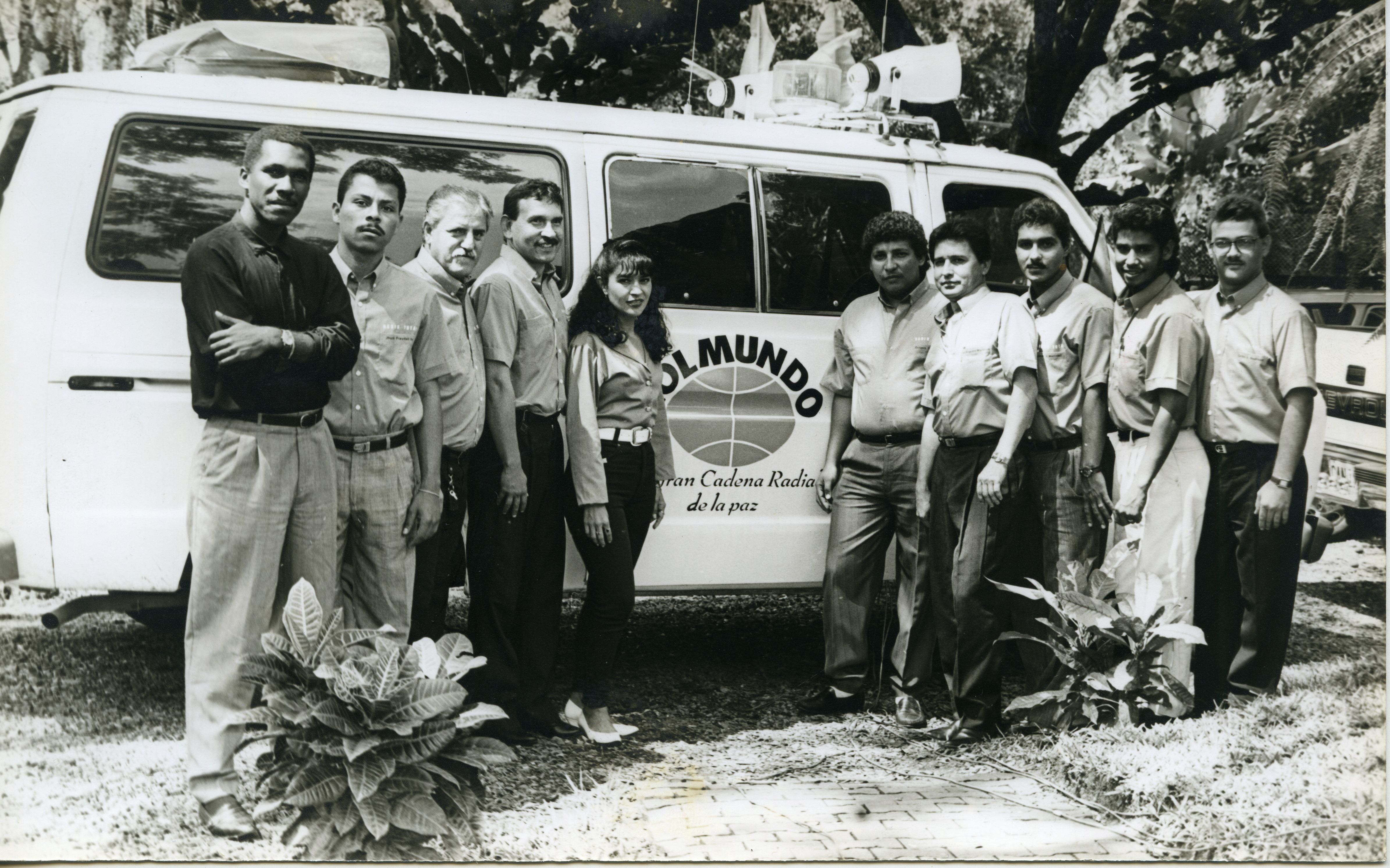 En la fotografía tomada en un espacio abierto. En la ilustración se distinguen a un grupo de diez reporteros posando en frente de una furgoneta. El vehículo es de color blanco, en un costado se distingue el logotipo de Colmundo"programa cadena radial de la paz"; y cuenta con un equipo de comunicación instalado en el techo.