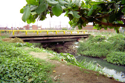 | dc.description | Plano medio. En un primer plano se aprecia parte del follaje de un árbol y al fondo un puente que cruza un canal, debajo de este puente algunas personas. | spa |
