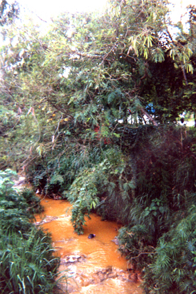 Plano general de toma a río El Chocho? del corregimiento La Castilla, contaminado, según nos cuenta el autor de la imagen. Arboles y plantas rodean la imagen.