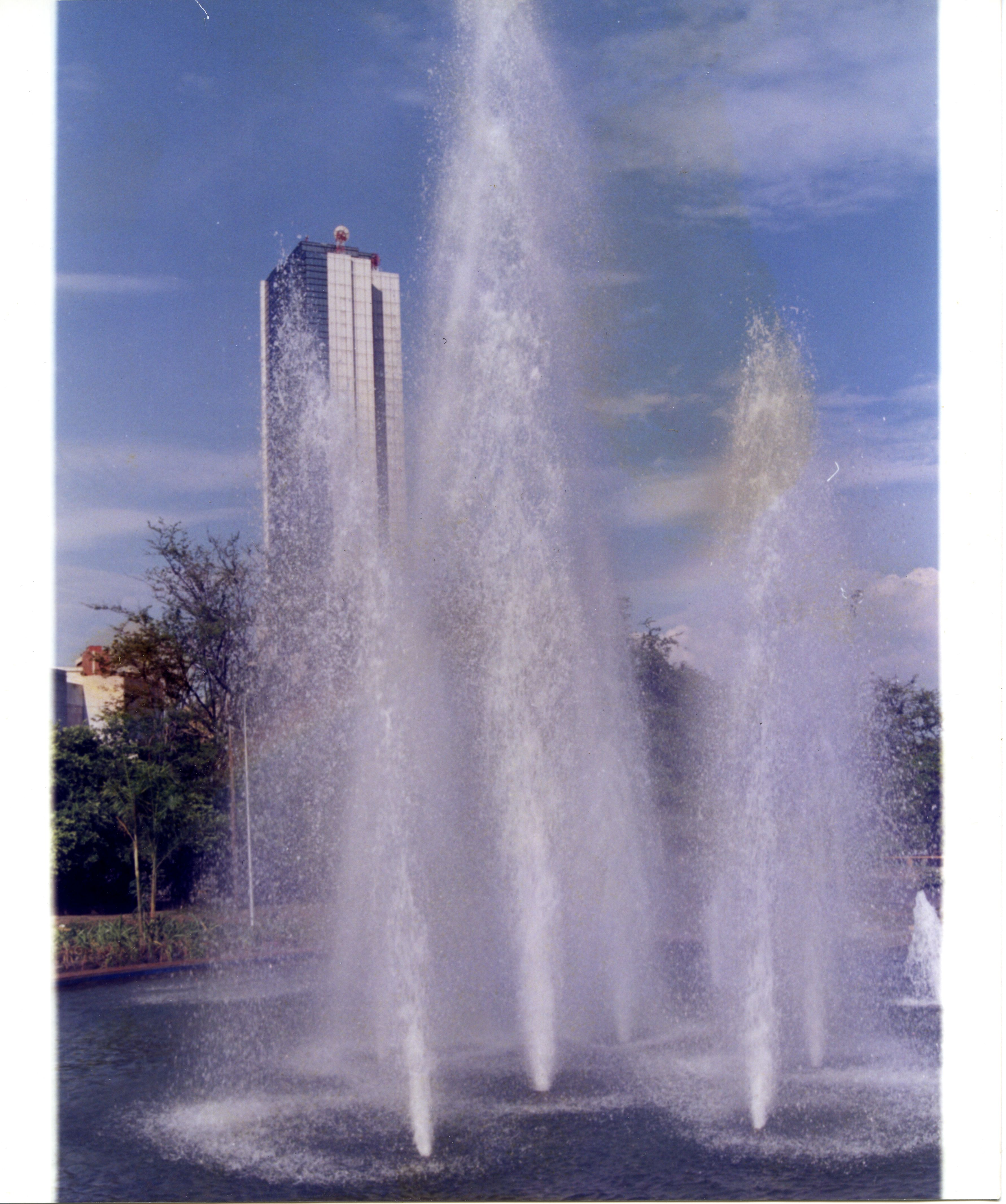 Foto de fuente de agua con la torre de Cali de fondo