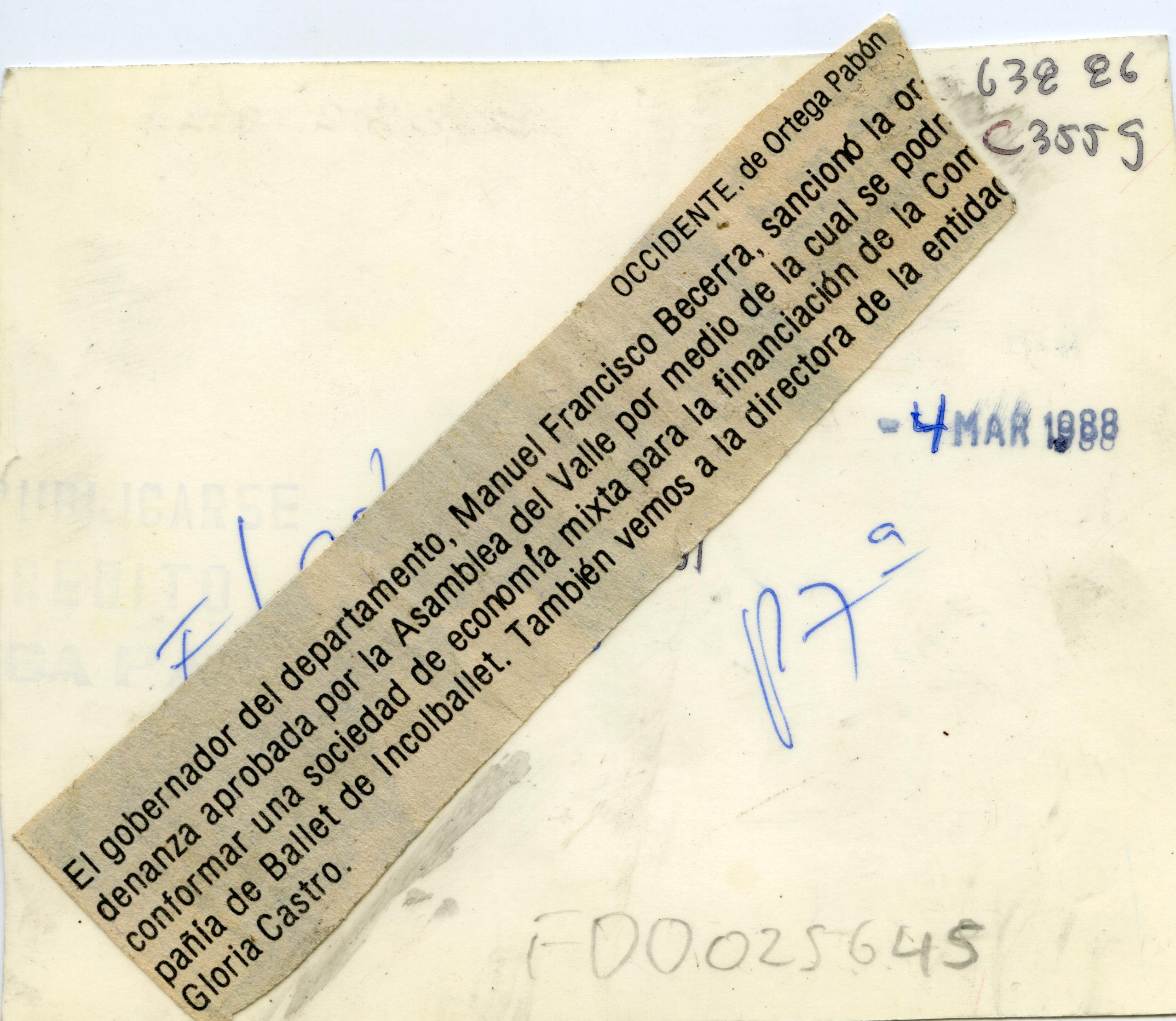 Reverso: El gobernador del departamento Manuel Francisco Becerra, sanciono la ordenanza aprobada por la Asamblea del Valle por medio de la cual se podra conformar una sociedad de economía mixta para la financiación de la compañia de Incolballet. También vemos a la directora de la entidad Gloria Castro