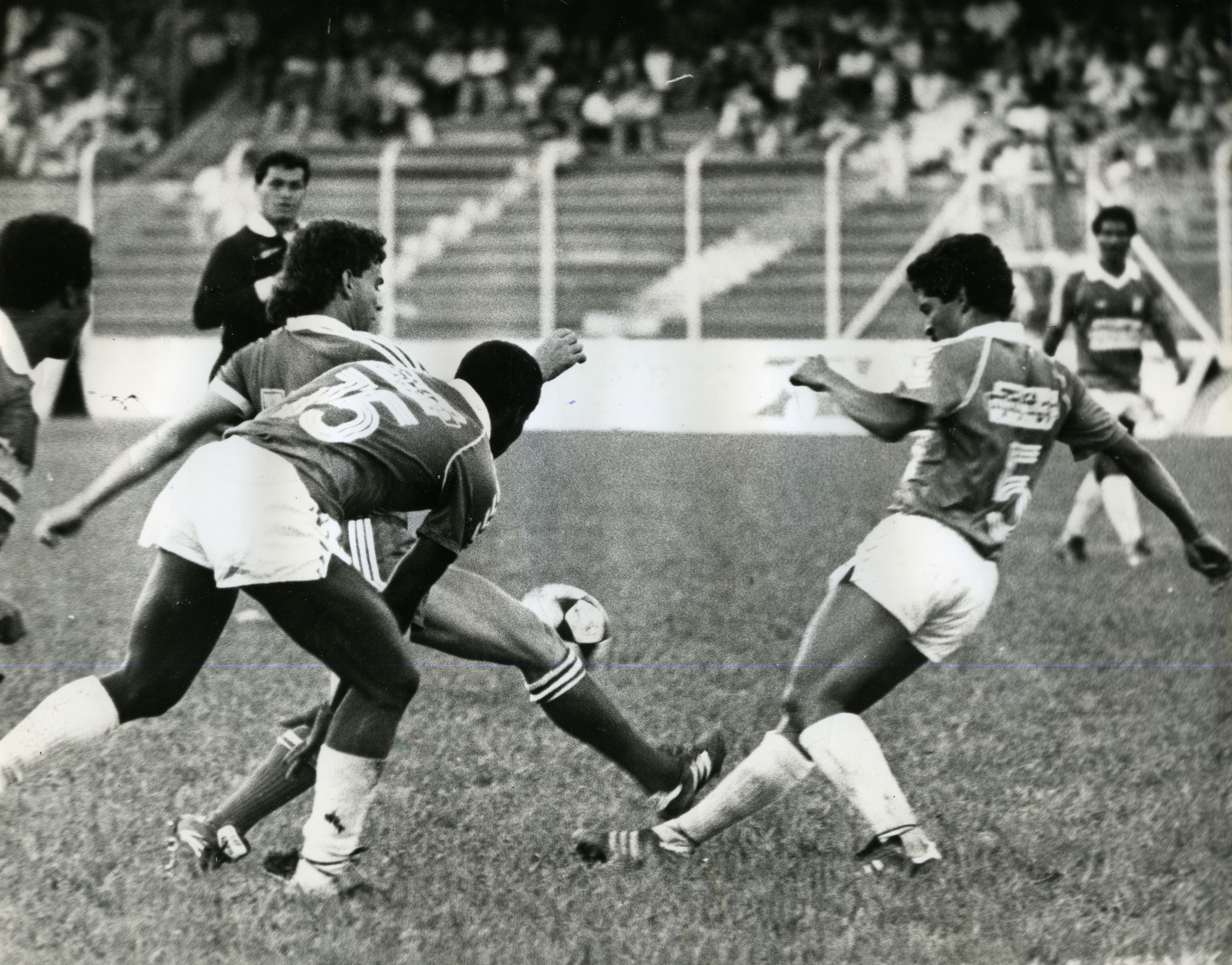 Partido de fútbol América de Cali vs Nacional en el estadio Pascual Guerrero. Se aprecia escena del partido y el arbitro observa la jugada