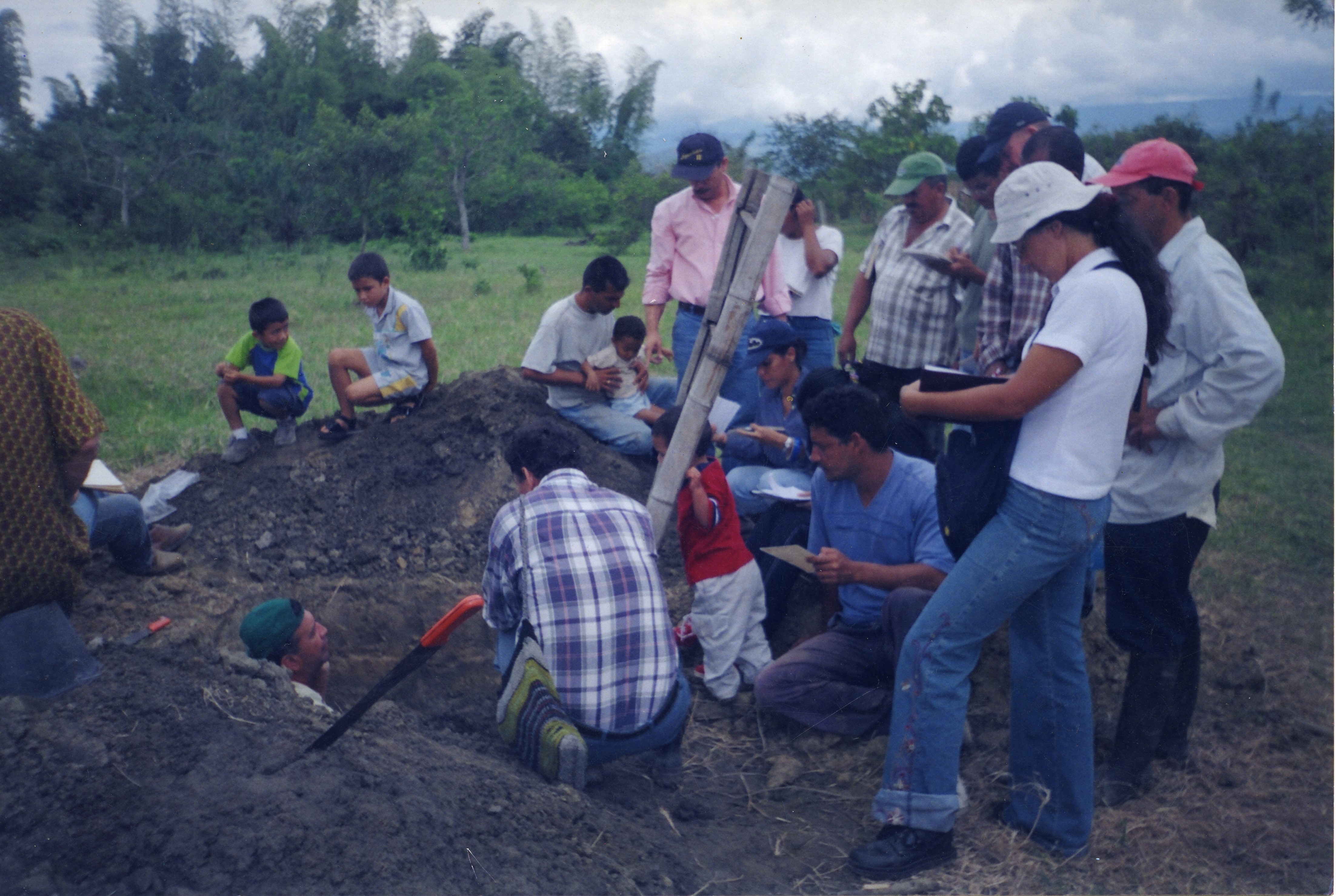 Grupo de agricultores analizando la tierra, al parecer acompañados por personas de la comunidad. Al reverso de la fotografía se anexa nota manuscrita:"Grupo de agricultores orgánicos de Andalucía hacen análisis y el estudio de la fertilidad de la tierra para luego emprender la siembra de cultivos sanos".