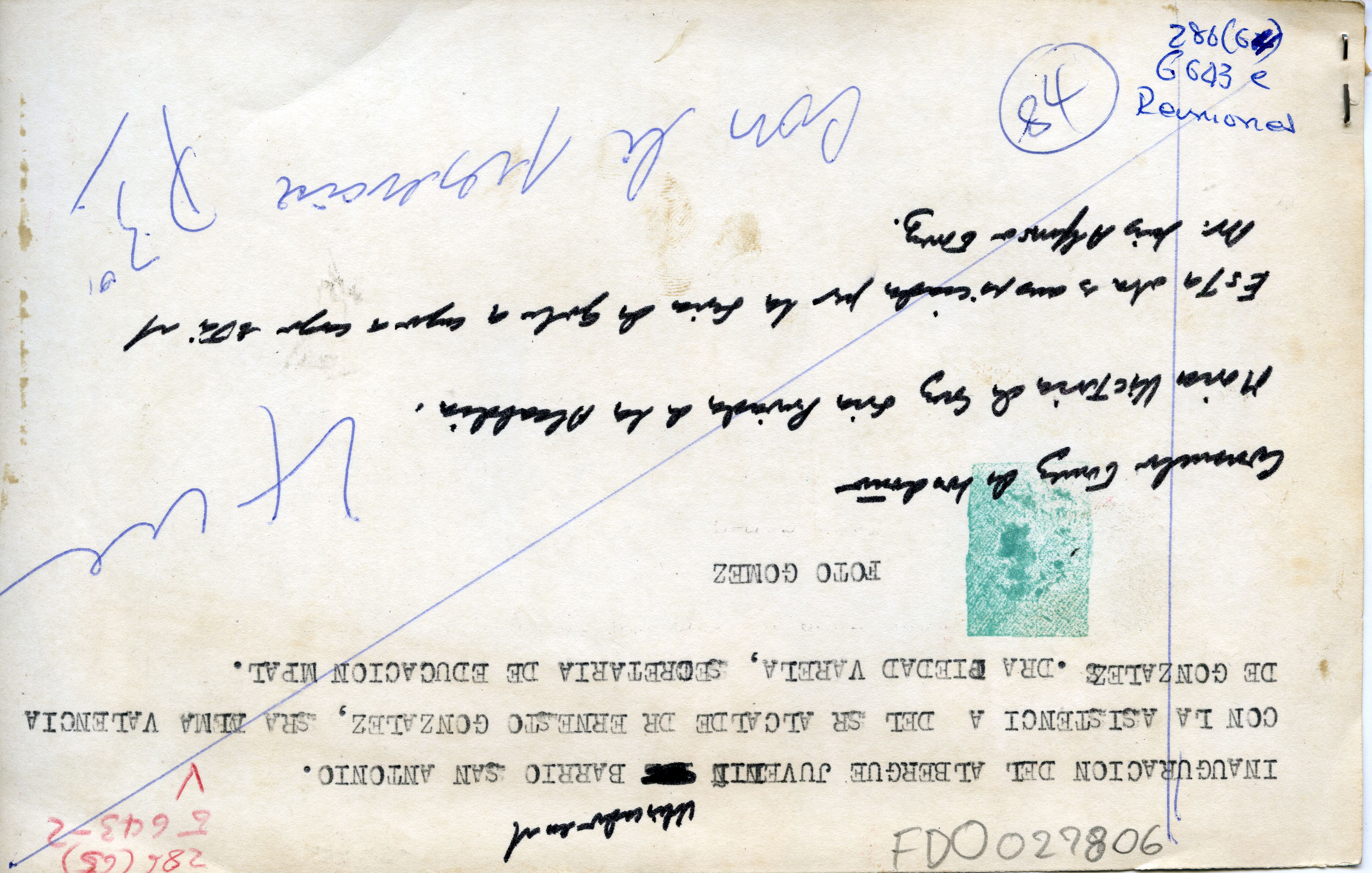 "Reverso (tipo maquina de escribir): Inauguración del albergue juvenil barrio San Antonio. Con la asistencia del sr. alcalde dr. Ernesto González, Sra Alma Valencia de González, dra. Piedad Valencia, secretaria de educación mpal."