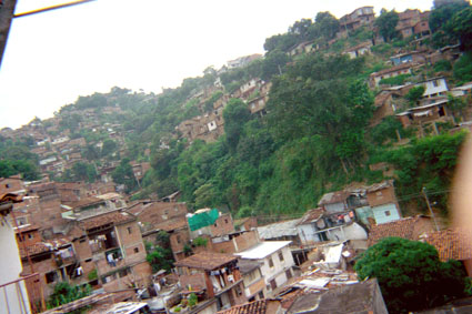 Vista panorámica de un barrio, donde se puede apreciar las viviendas elaboradas en ladrillo, en su mayoría, dispuestas en una montaña con vegetación abundante.