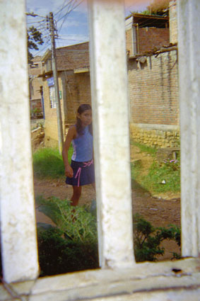 Plano medio. Imagen tomada en el interior de una vivienda, donde se destaca por la luz del flash una reja de color blanco y a través de ella una joven y algunas viviendas al fondo.