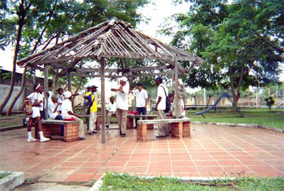 Plano general. Jóvenes reunidos en el parque infantil Marco Tulio Velasco. Sobresale quiosco en mal estado. Exterior día.