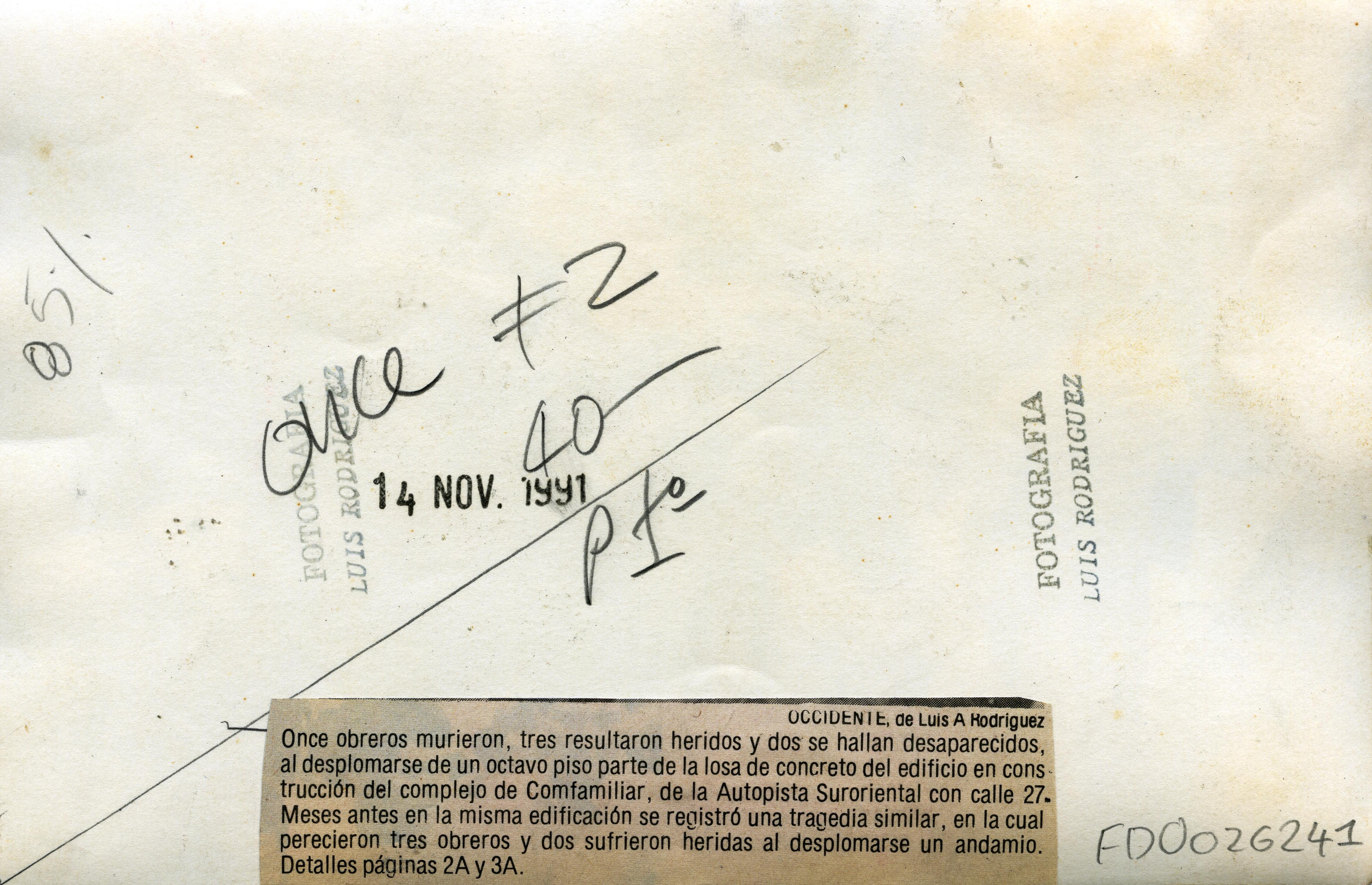 Reverso: Once obreros murieron, tres resultaron heridos y dos se hallan desaparecidos, al desplomarse de un octavo piso parte de la losa de concreto del edificio en construcción de complejo de Comfamiliar, de la Autopista Suroriental con calle 27. Meses antes en la misma edificación se registró una tragedia similar, en la cual perecieron tres obreros y dos sufrieron heridas al desplomarse un andamio.