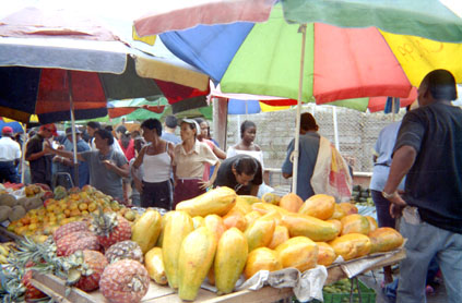 Plano medio. Exterior día. Perspectiva de galería. En primer plano brillantes papayas junto a piñas. Personajes en franja central. Realce de parasoles con colores vivos.