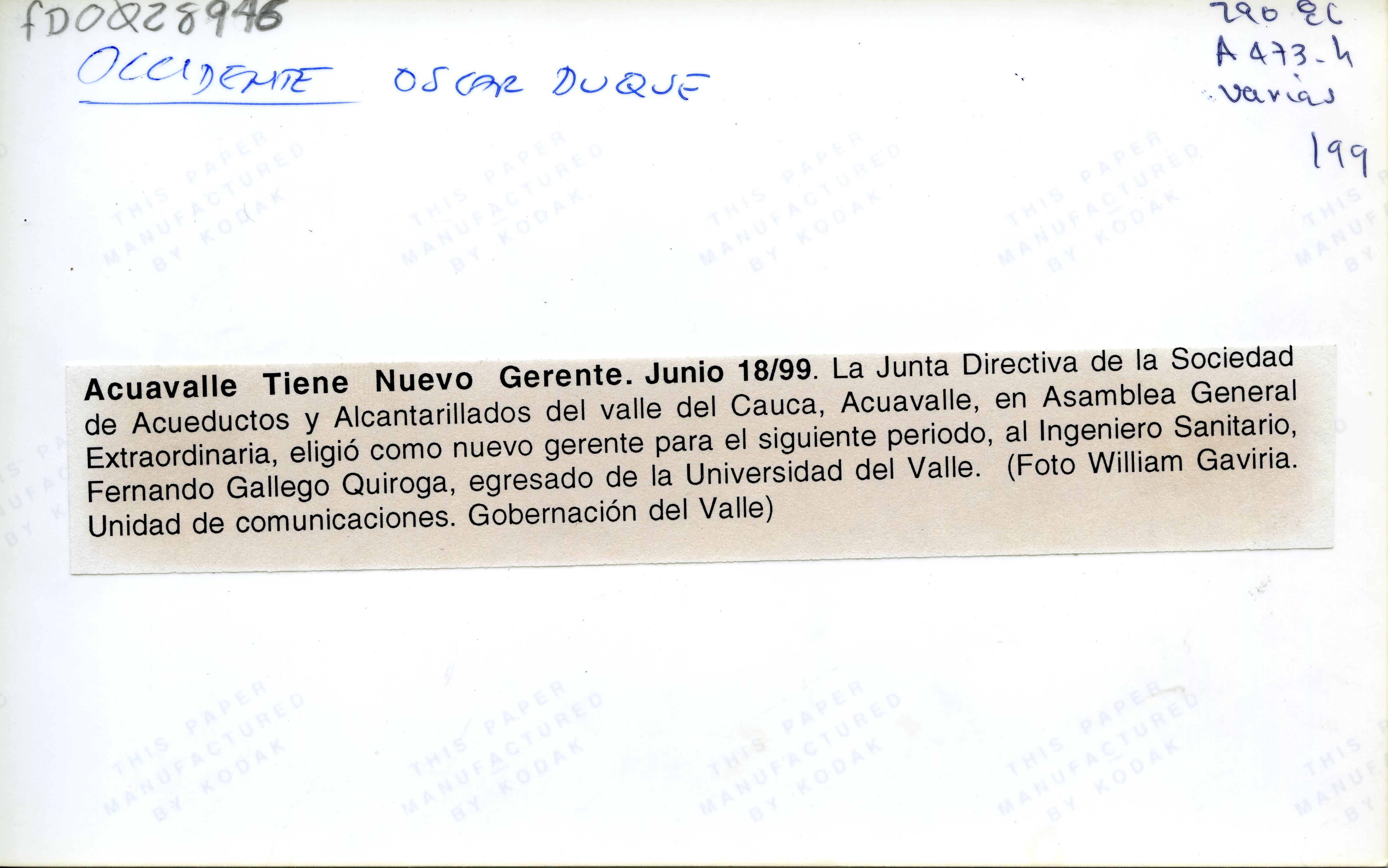 Reverso,"Acuavalle Tiene Nuevo Gerente. Junio 18/99. La junta directiva de la sociedad de acueductos y alcantarillados del valle del cauca, Acuavalle, en asamblea general extraordinario, eligió como nuevo gerente para el siguiente período, al ingeniero sanitario, Fernando Gallego Quiroga, Egresado de la universidad del valle."