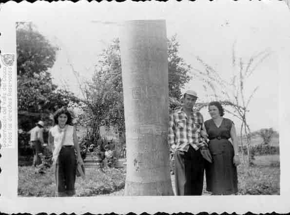 Guacariceños de paseo por el parque. Se observa en primer plano el tronco de la gran ceiba, árbol característico de nuestra región. Guacarí. C. 1950.