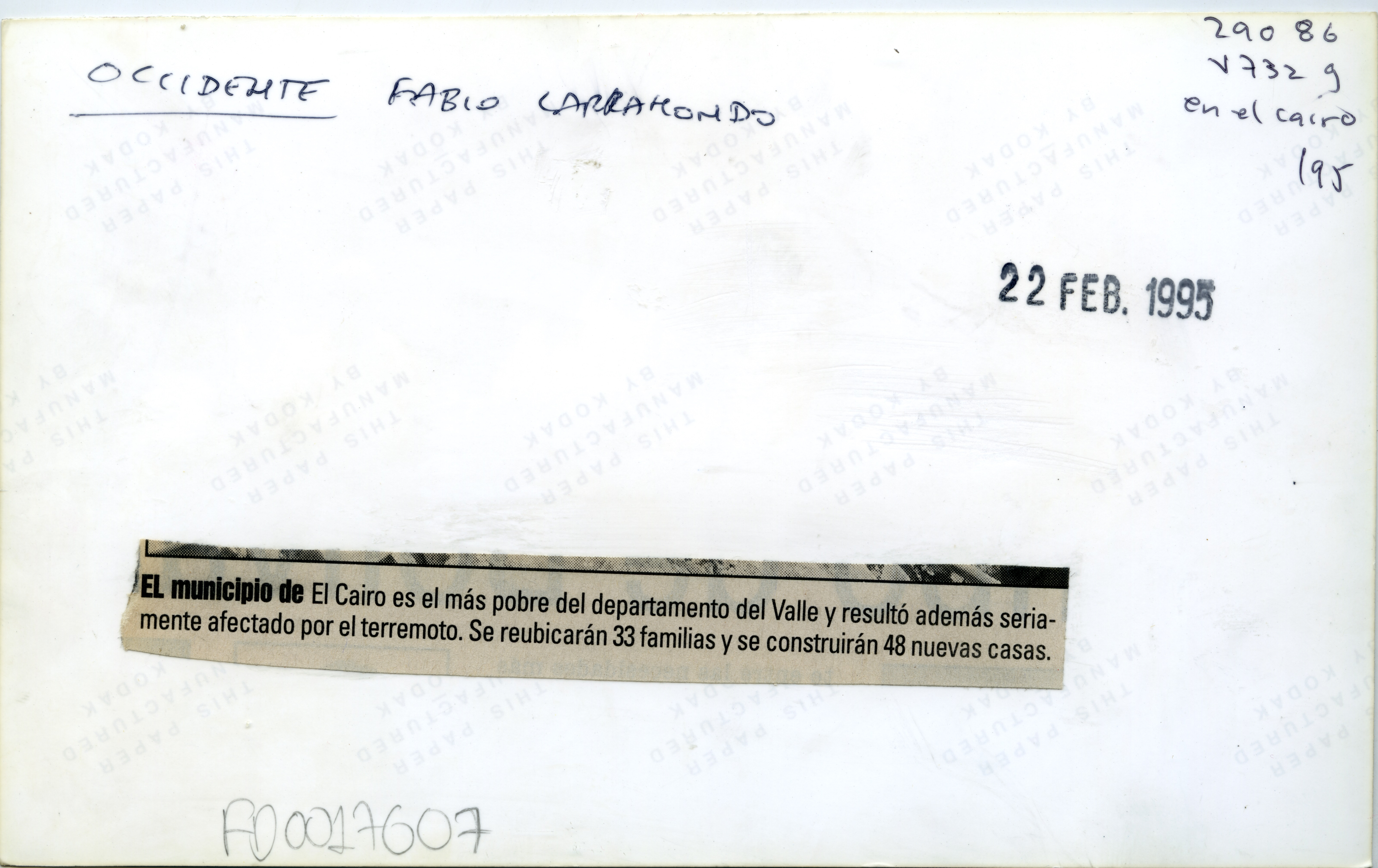 Al reverso de la fotografía se anexa recorte: " El municipio del Cairo es el más pobre del departamento del Valle y resultó además seriamente afectado por el terremoto. Se reubicarán 33 familias y se construirán 48 nuevas casas."