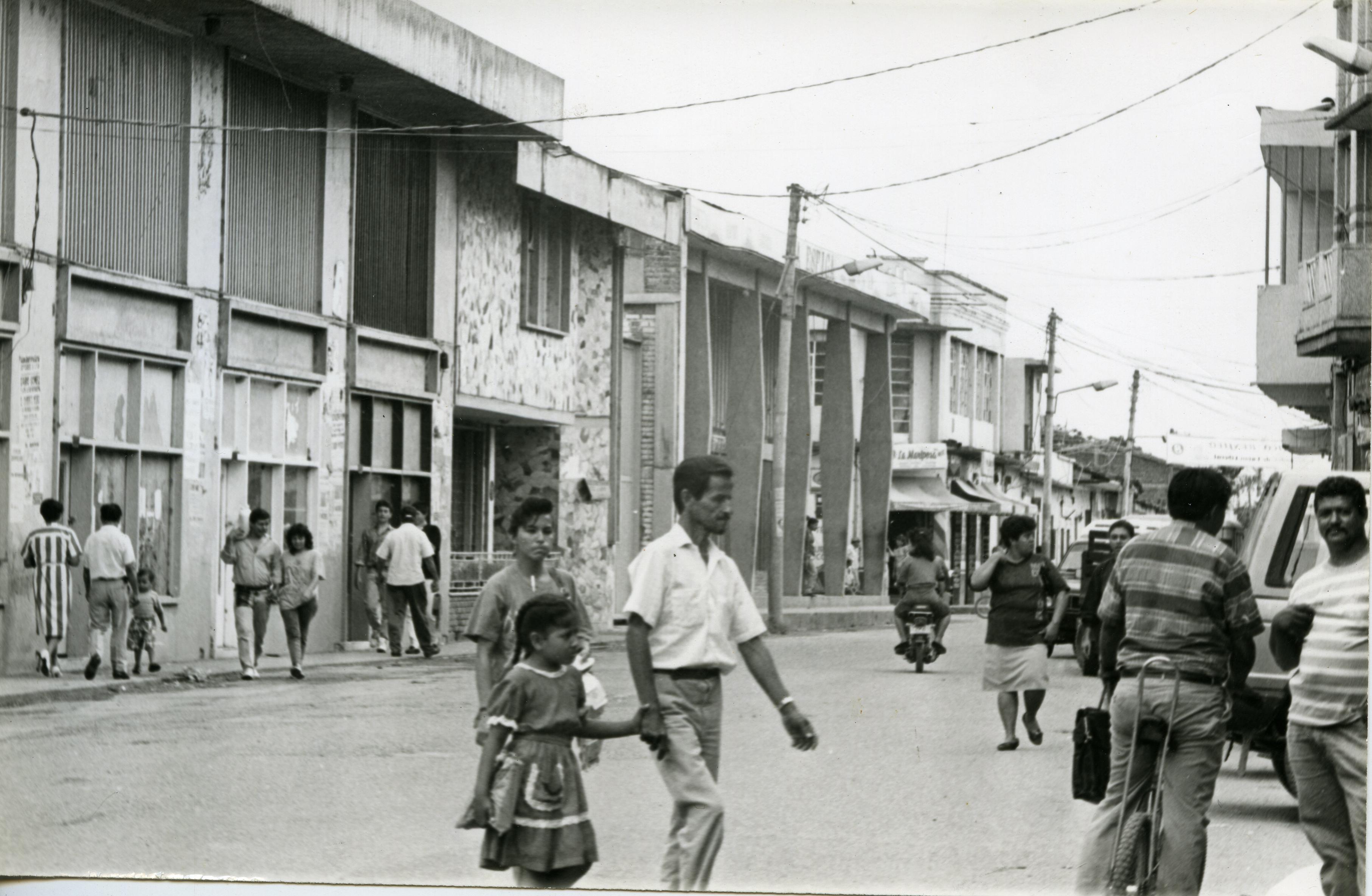 En la gráfica se observa una calle en Zarzal. Se observan personas transitando, las fachadas de las casas y algunos vehículos.