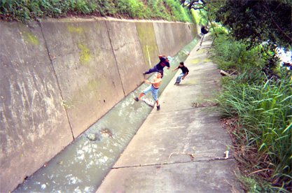 Plano general. Tres jóvenes jugando en medio de un canal colector de aguas residuales. La imagen capta el momento en el cual ellos brincan entre los muros del canal. Paralelismo de líneas. Perspectiva lineal diagonal con punto de fuga.
