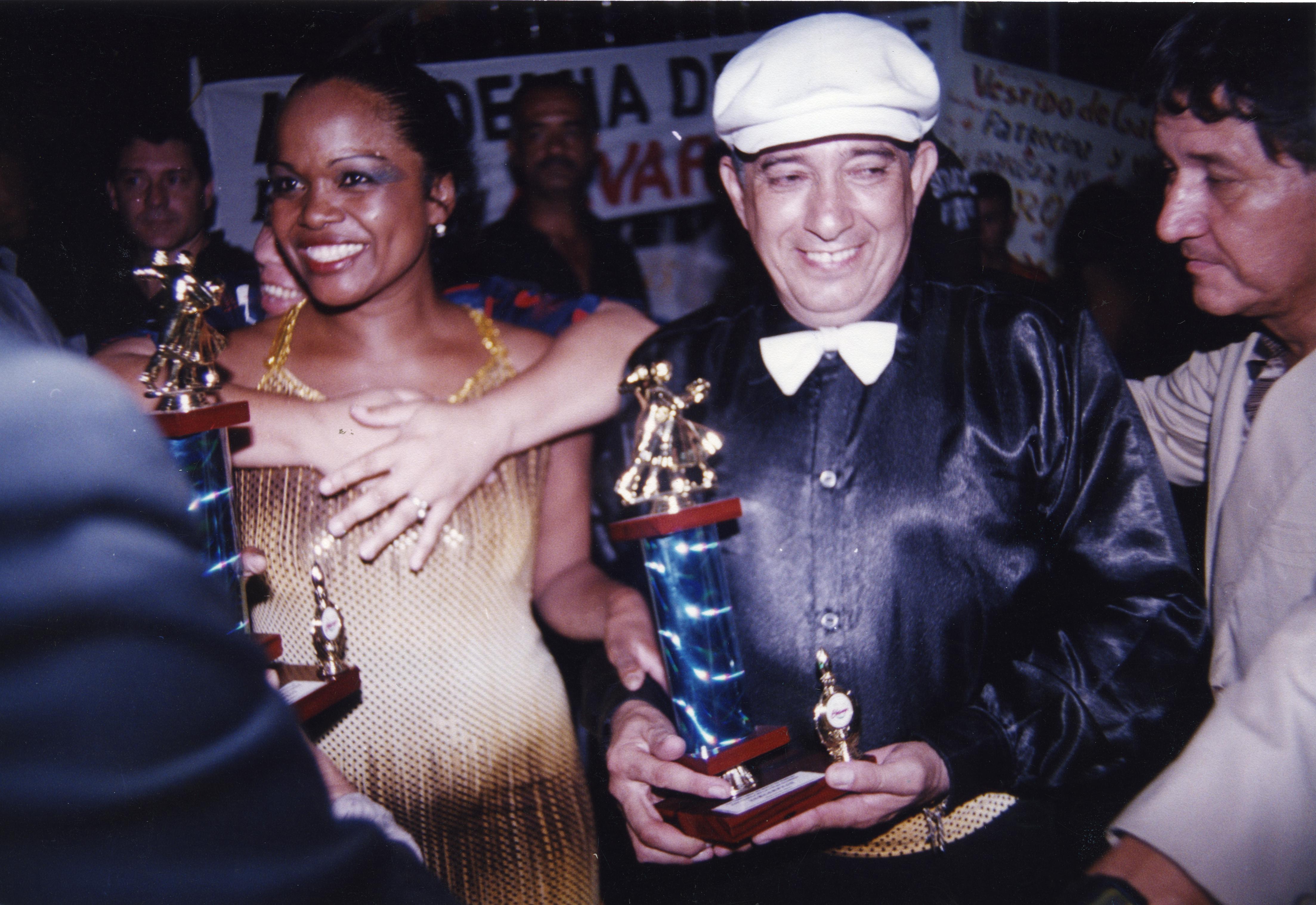 En la gráfica se aprecia primer concurso de baile por parejas. Observamos pareja recibiendo trofeos por el segundo puesto y están sonriendo