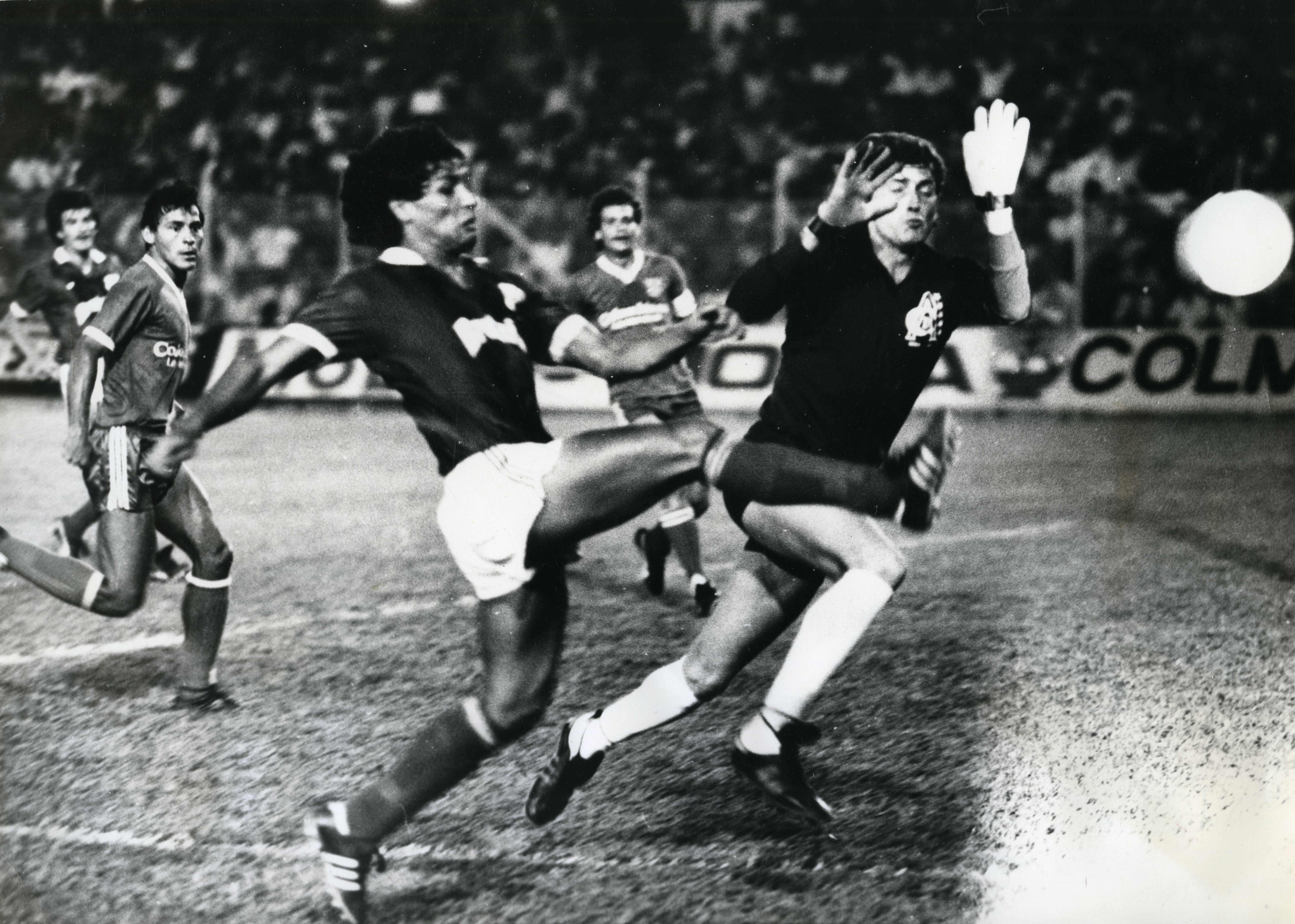 Partido de fútbol entre los equipos América y Deportivo Cali jugado en el estadio Pascual Guerrero. Se aprecia disputa del balón entre Aravena y Falcioni. Observamos público en la tribuna
