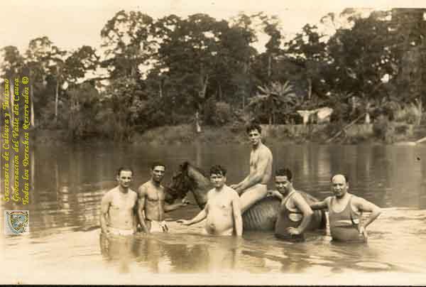 Luis Mario Ramírez y acompañantes, disfrutando de las aguas del río Cauca. Buga, 1958.