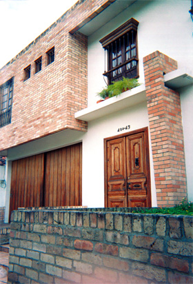 Plano medio. Imagen tomada en diagonal. Vivienda con fachada en ladrillo pulido y paredes blancas. Puertas y ventanas en madera.