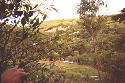 Plano general. Viviendas ubicadas en medio de una zona campestre. En la parte inferior izquierda una mano parece señalar algo. Arbustos intervienen el primer plano de la imagen.