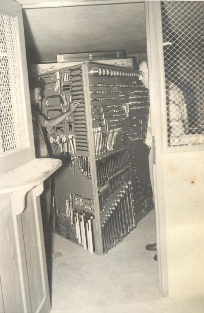 Estudiante organizando las herramientas donadas por el Proyecto Sceca al Instituto Antonio José Camacho. Actualmente se conoce como Instituto Educativo Técnico Industrial Antonio José Camacho. Santiago de Cali, 1970.