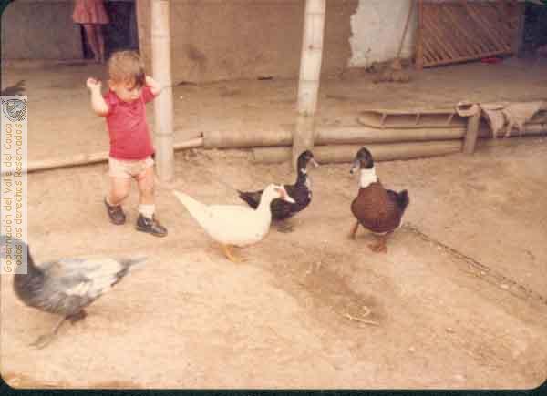 Carlos Arango en el patio de la casa jugando con aves de corral, entre ellos patos chilenos. El Dovio. C. 1980