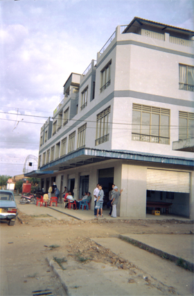 En primer plano una calle en regular estado. Se observan sujetos en exterior de una edificación. Plano general.