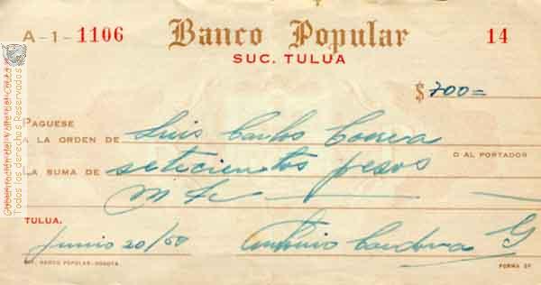 Cheque del Banco Popular de la Sucursal de Tuluá. 1958.