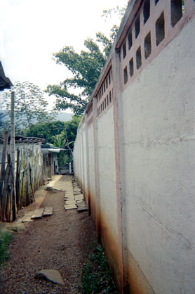 Perspectiva lineal de callejuela con punto de fuga. Exterior día. Escena con profundidad de campo.