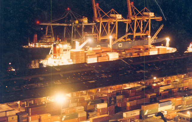 Panorámica nocturna del muelle, zona de cargue y descargue. Buenaventura, 1999.