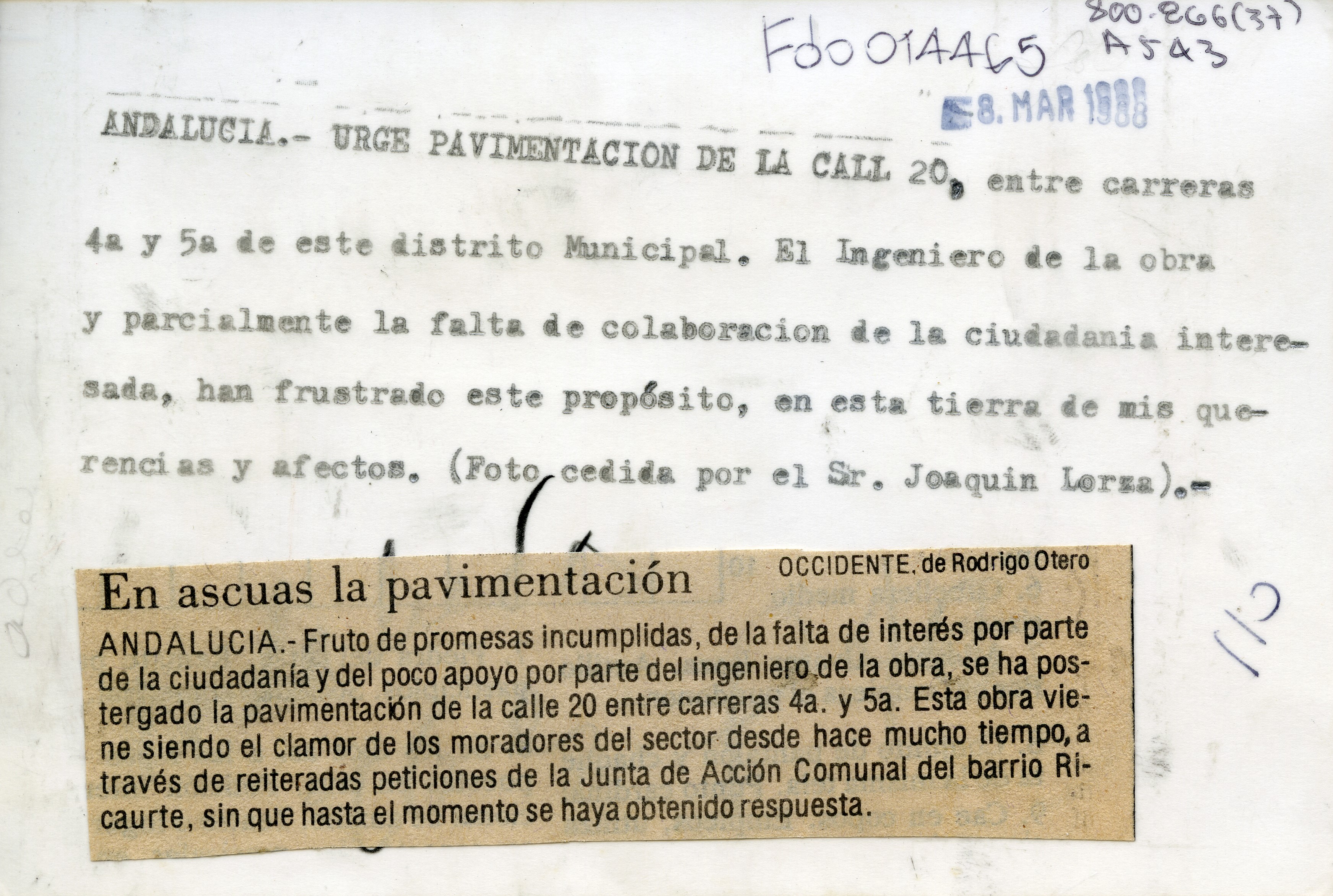 | dc.description.abstract | Plano general de segmento de la calle 20 sin pavimentar, se observa una gasolinera Terpel. Al reverso de la fotografía se anexa recorte: "En ascuas la pavimentación. Fruto de promesas incumplidas, de la falta de interés por parte de la ciudadanía y del poco apoyo por parte del ingeniero de la obra, se ha postergado la pavimentación de la calle 20 entre carreras 4 y 5. Esta obra viene siendo el clamor de los moradores del sector desde hace mucho tiempo, a través de reiteradas peticiones de la Junta de Acción Comunal del barrio Ricaurte, sin que hasta el momento se haya obtenido respuesta". | spa |