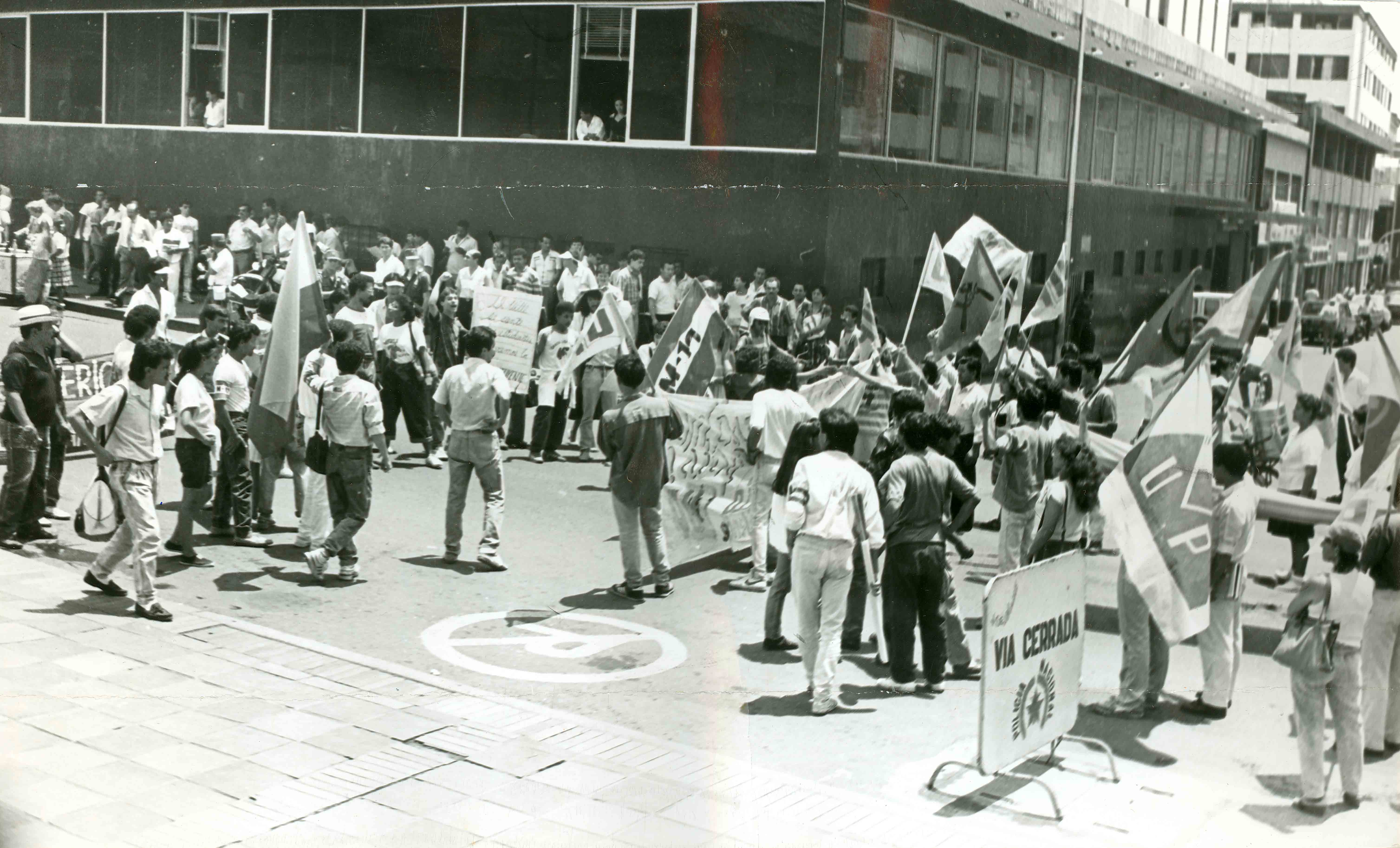 Foto a blanco y negro en el que se aprecian militantes de la Unión Patriótica y otros sectores efectuando una manifestación de duelo y rechazo por el asesinato del presidente de esa agrupación política y a la vez candidato a la Presidencia de la ´Repúblic, Bernardo Jaramillo Ossa, acaecida en Bogotá. Además de unas escaramuzas en la Universidad del Valle, en donde fueron suspendidas las actividades académicas, la tranquilidad se mantuvo en Cali y el departamento. En los brotes controlados rápidamente fueron averiadas mallas de seguridad de la universidad y un bus. El Archivo del Patrimonio Fotográfico y Fílmico del Valle del Cauca es responsabilidad de la Biblioteca Departamental del Valle Jorge Garcés Borrero, por convenio de cooperación suscrito con la Secretaria del Cultura Departamental, con el fin de aunar esfuerzos para su conservación, preservación y divulgación del Archivo entre la comunidad Vallecaucana, especialmente entre los estudiantes e investigadores que visitan la Biblioteca, propiciando el su uso y consulta permanente. La universidad Icesi es un colaborador en el proceso de difusión, facilitando la tecnología que permite la consulta de las imágenes.