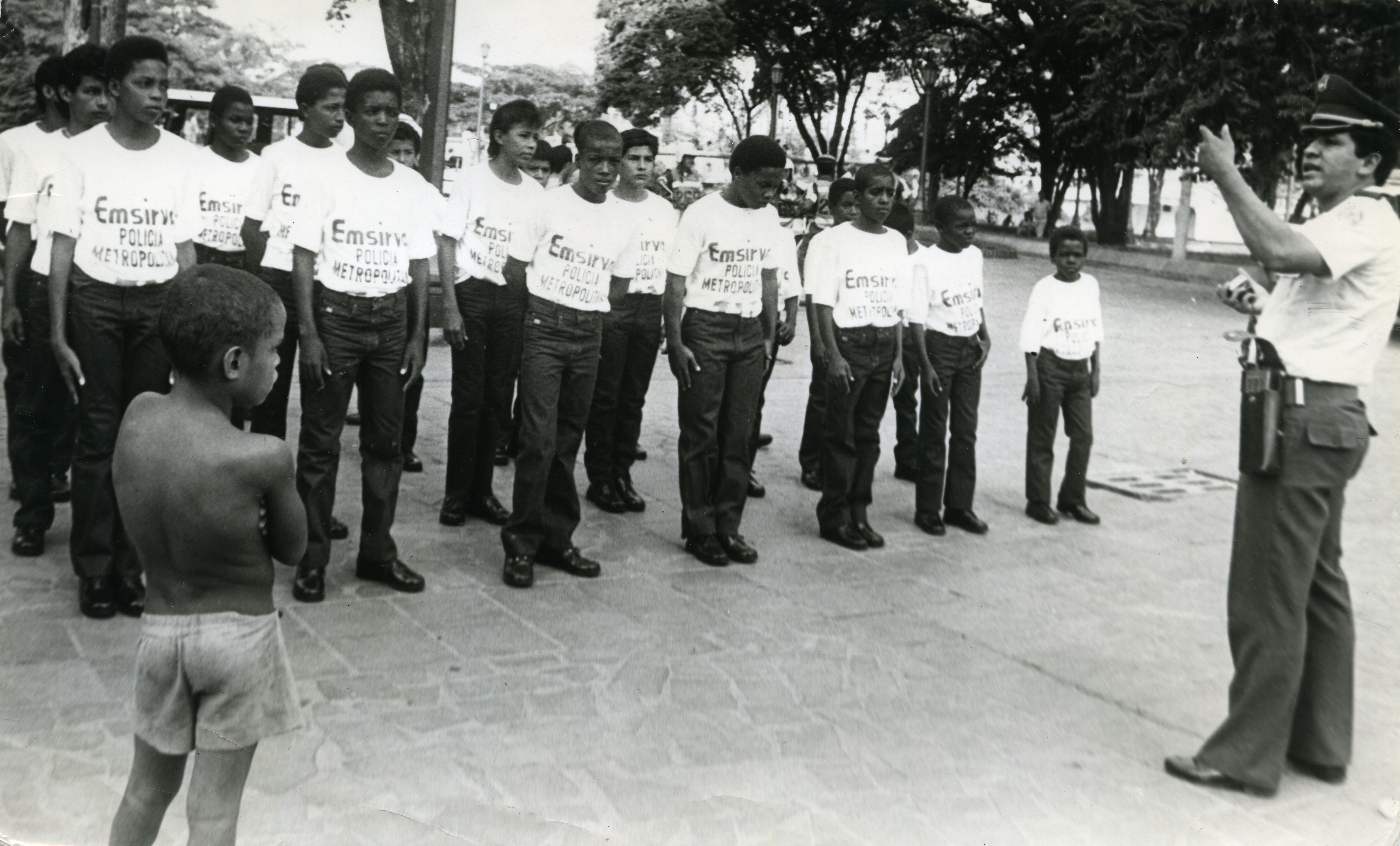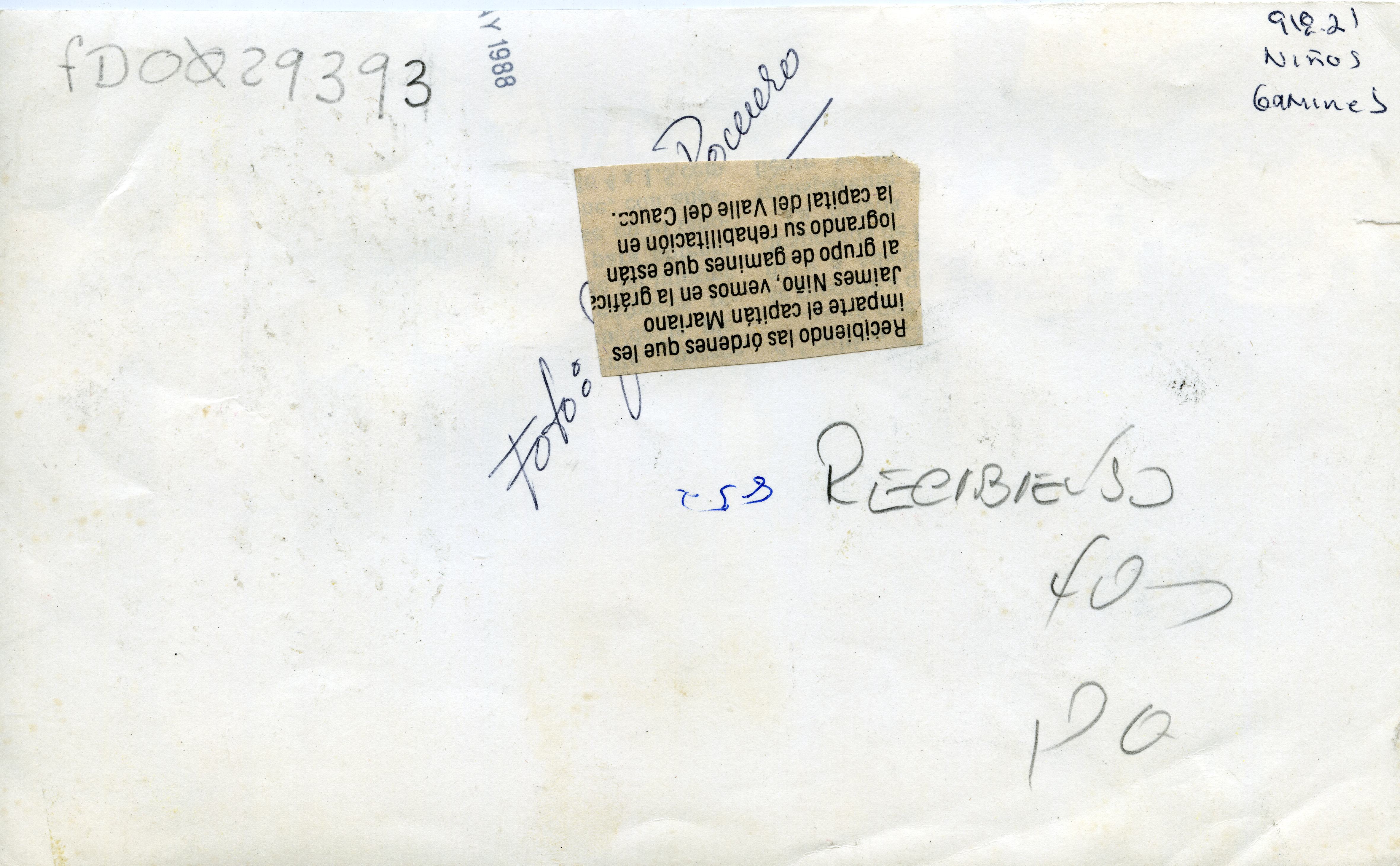 Un niño vulnerable es aquel que se encuentra en riesgo constante de ser perjudicado, maltratado, perseguido, lastimado, discriminado, menospreciado o influenciado negativamente por agentes hostiles frente a los que se halla en situación de inferioridad, indefenso o fragilidad. En la foto, el capitán de la policía, Mariano Jaime Niño, impartiendo ordenes a los gamines en su proceso de rehabilitación. Al reverso de la foto: Recibiendo las ordenes que les imparte el capitán Mariano Jaimes Niño, vemos en la gráfica al grupo de gamines que están logrando su rehabilitación en la capital del Valle del Cauca. El Archivo del Patrimonio Fotográfico y Fílmico del Valle del Cauca es responsabilidad de la Biblioteca Departamental del Valle Jorge Garcés Borrero, por convenio de cooperación suscrito con la Secretaría de Cultura Departamental, con el fin de aunar esfuerzos para su conservación, preservación y divulgación del Archivo entre la comunidad Vallecaucana, especialmente entre los estudiantes e investigadores que visitan la Biblioteca, propiciando su uso y consulta permanente. La universidad Icesi es un colaborador en el proceso de difusión, facilitando la tecnología que permite la consulta de las imágenes