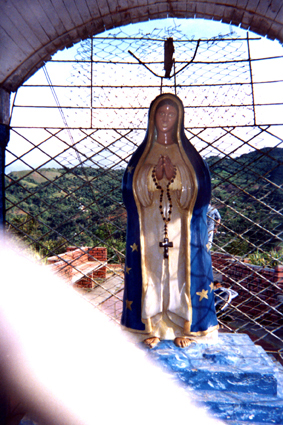 Primer plano de la virgen con manto azul y estrellas doradas. Detrás de ella la malla que da hacia el exterior donde podemos distinguir claramente una construcción en ladrillo, la montaña verde y el cielo azul.
