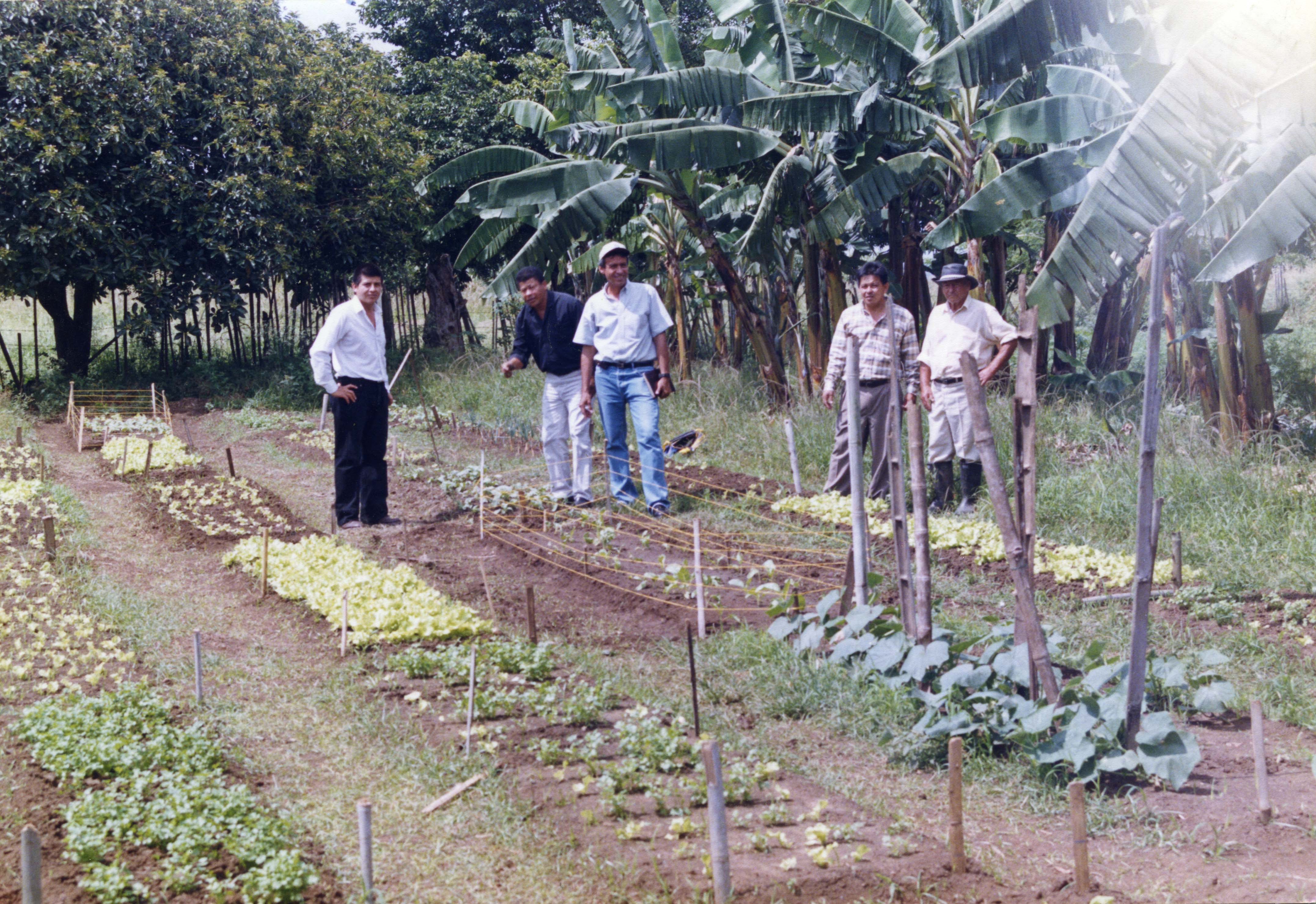 En el pie de foto dice lo siguiente: Prácticas Agropecuarias en el proyecto de agricultura. De izquierda a derecha Dimaro Piedrahita Toro, Torge Octavio Paz, Carlos Chávez, Luis Alberto Galindez, Girón, y Alejandro Perez