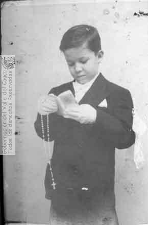 Edgar Saavedra en la celebración de la Primera Comunión. Este niño llegó en su adultez a ser Magistrado de la República. Zarzal, C. 1940.