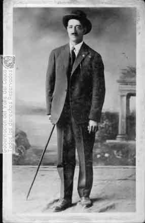 Rafael Arango en un estudio fotográfico. El Dovio. C. 1935. Las fotografías de estudio tenían grandes telones de fondo para construir el decorado de las imágenes. Algunas hacian alegoría a sitios mundialmente muy conocidos.