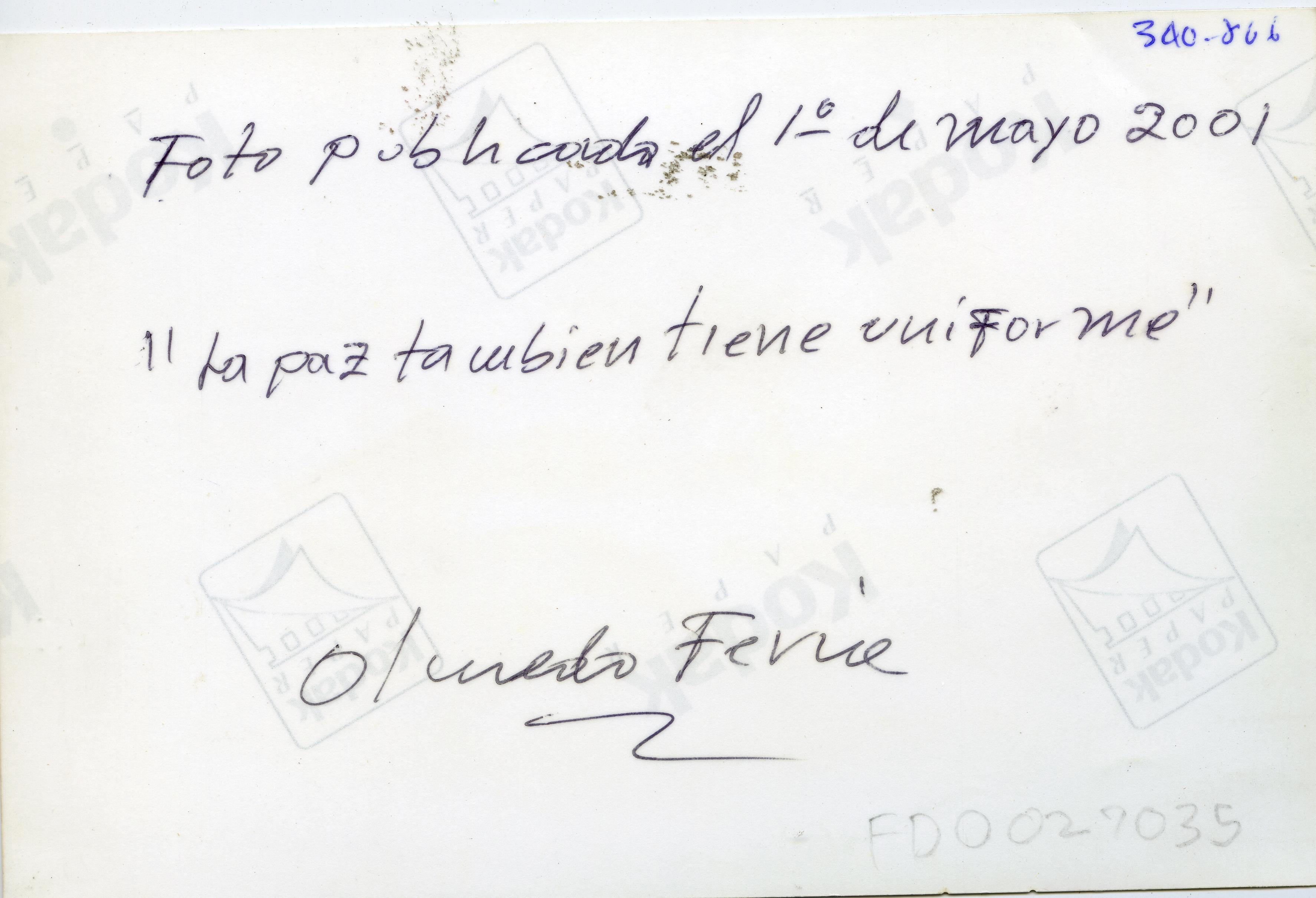 Reverso: Foto publicada el 1ero de mayo de 2001 "La paz también tiene uniforme"