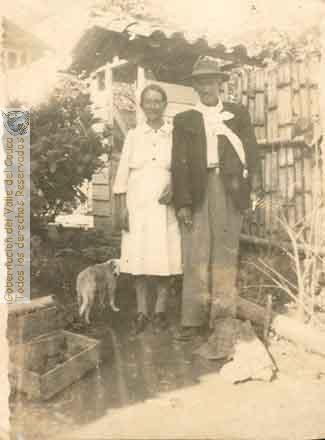 Se observa al fondo un cercado, construcción hecha en guadua para encerrar lotes o separar solares y patios de las casas. Esta forma de encerramiento ha desaparecido casi completamente en los espacios urbanos de los municipios. En la foto María Antonia ortíz y Julio Rodríguez en su casa del Alto de Monserrate. Sevilla. 1950.