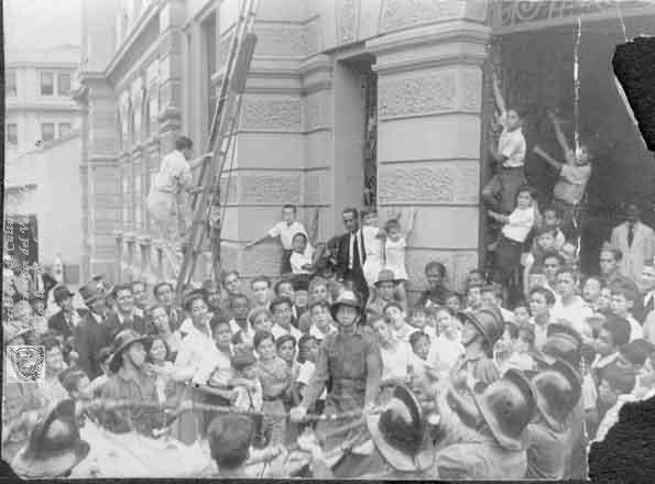 Maniobras del Cuerpo de Bomberos por la carrera cuarta junto al Palacio Nacional , con una concurrida asistencia de la comunidad caleña. Cali. C. 1940.